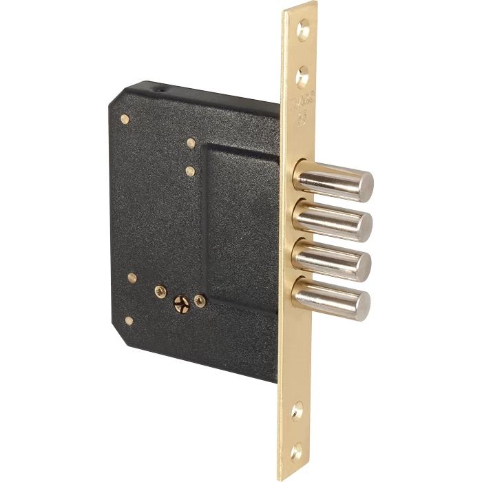 Врезной замок Fuaro 200-4MF с крестовым цилиндровым механизмом и 4 ригелями. Подходит для установки на деревянные и легкие металлические двери. Секретность замка составляет 55 000 комбинаций. Вылет ригеля: 27 мм. Бэксет: 50 мм. Ширина лицевой планки: 22 мм. В комплектацию входят: ответная планка, декоративная накладка, 5 ключей. Цвет: латунь.